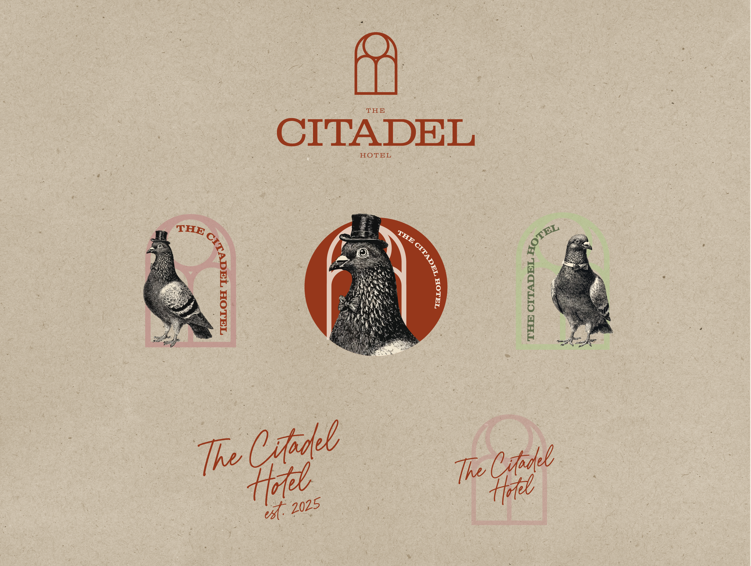 The typographic system is inspired by the original stone lettering — sturdy slabs, historic charm. The logo mark comes from the Citadel’s central arched window, a symbol of restoration and return. The pigeons — long-time residents — appear as secondary marks, dressed in top hats and bowties for a touch of Yorkshire humour.